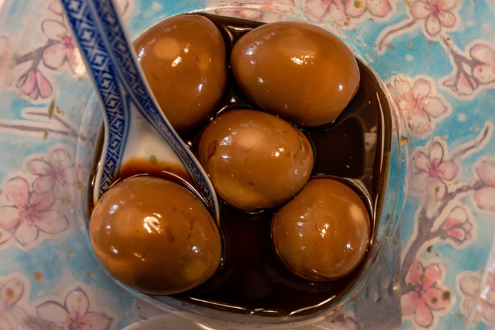 Originally, I had wanted pink pickled eggs like my grandmother would’ve made in her kitchen. But in this “use what you have” kitchen moment, I didn’t have beets that make the eggs distinctively pink. What I did have was soy sauce. The outcome was a batch of sweet and salty, semi-hard-boiled eggs that are very nice for snacking, plate garnish, and for topping off salad and soup.