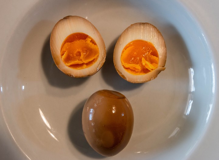 Here, I kept the boiling bath time to 6.5 minutes. This produced semi-translucent yolks that had a creamy texture more comparable to the inside of a chocolate Cadbury cream egg, or fudge. The firm whites absorbed the marinade color and flavors. When sliced open as in the photo above, you can see how the marinade penetrates. The eggs in my photos were cut open after 18 hours. The longer you keep them in the marinade, the saltier and darker they become. And maybe, that’s exactly what you are craving right now.